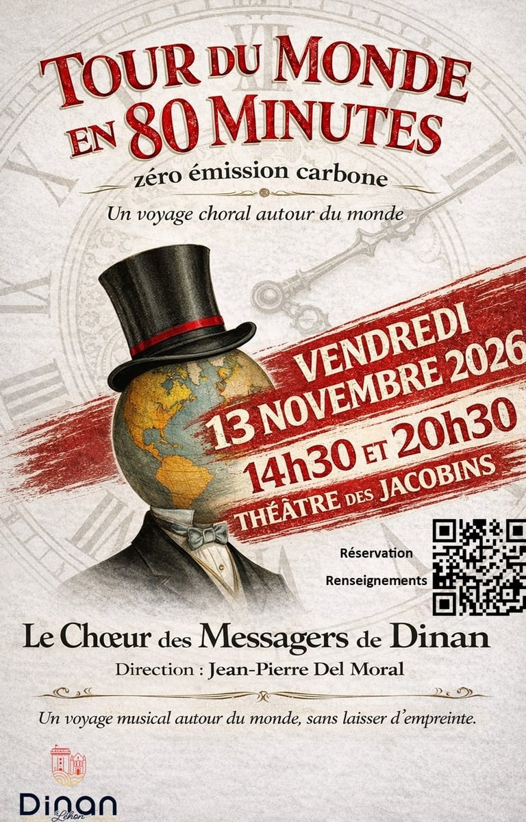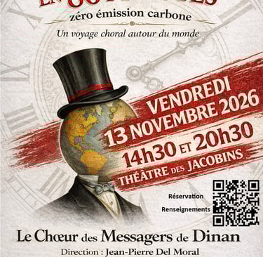 A l'heure où la sauvegarde de notre planète Terre est devenue un enjeu majeur, le Choeur des Messagers de Dinan vous propose de réaliser un tour du monde en 80 minutes, avec zéro émission carbone et sans quitter votre fauteuil ...